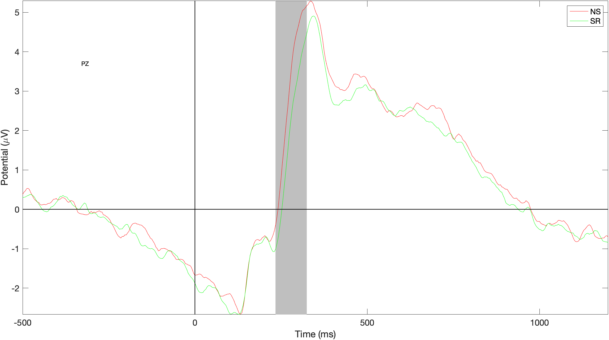 Grey bar shows statistically significant differences in amplitude at the start of P3