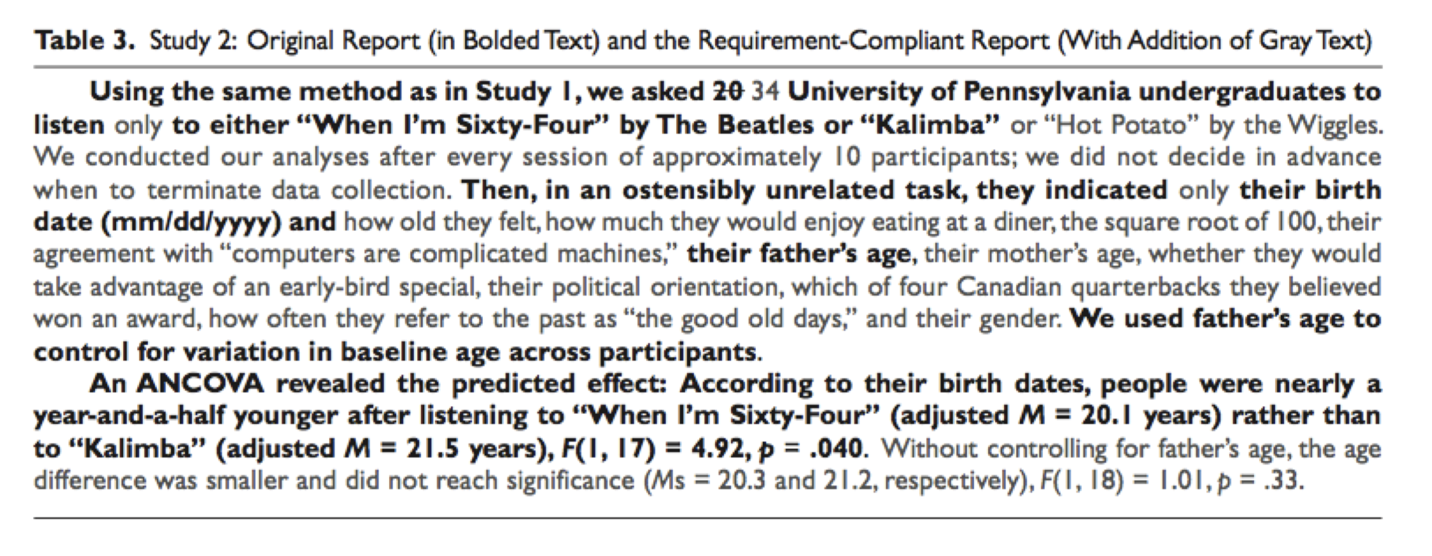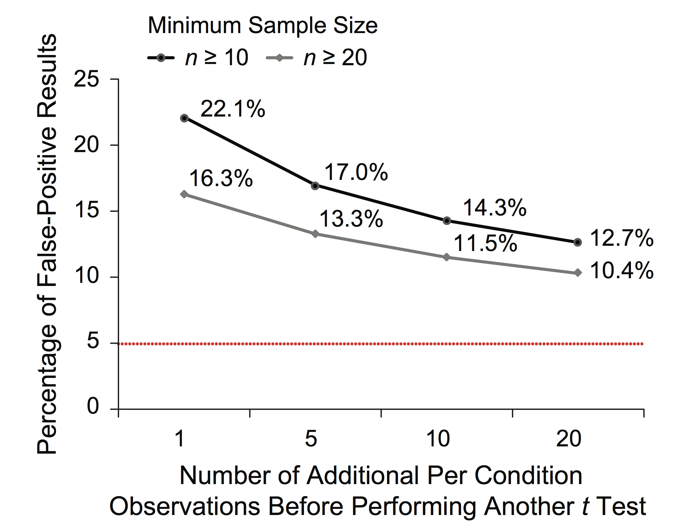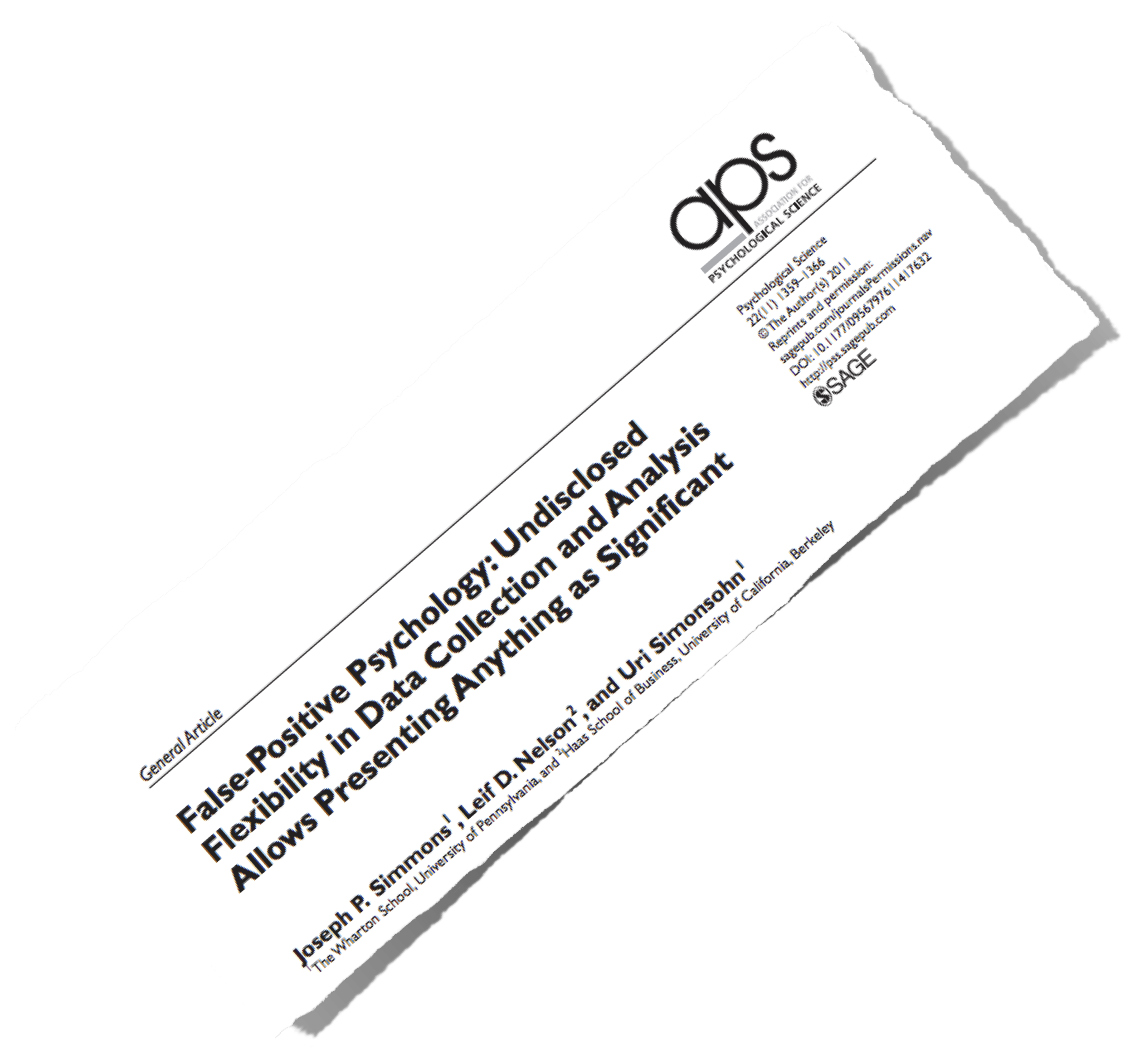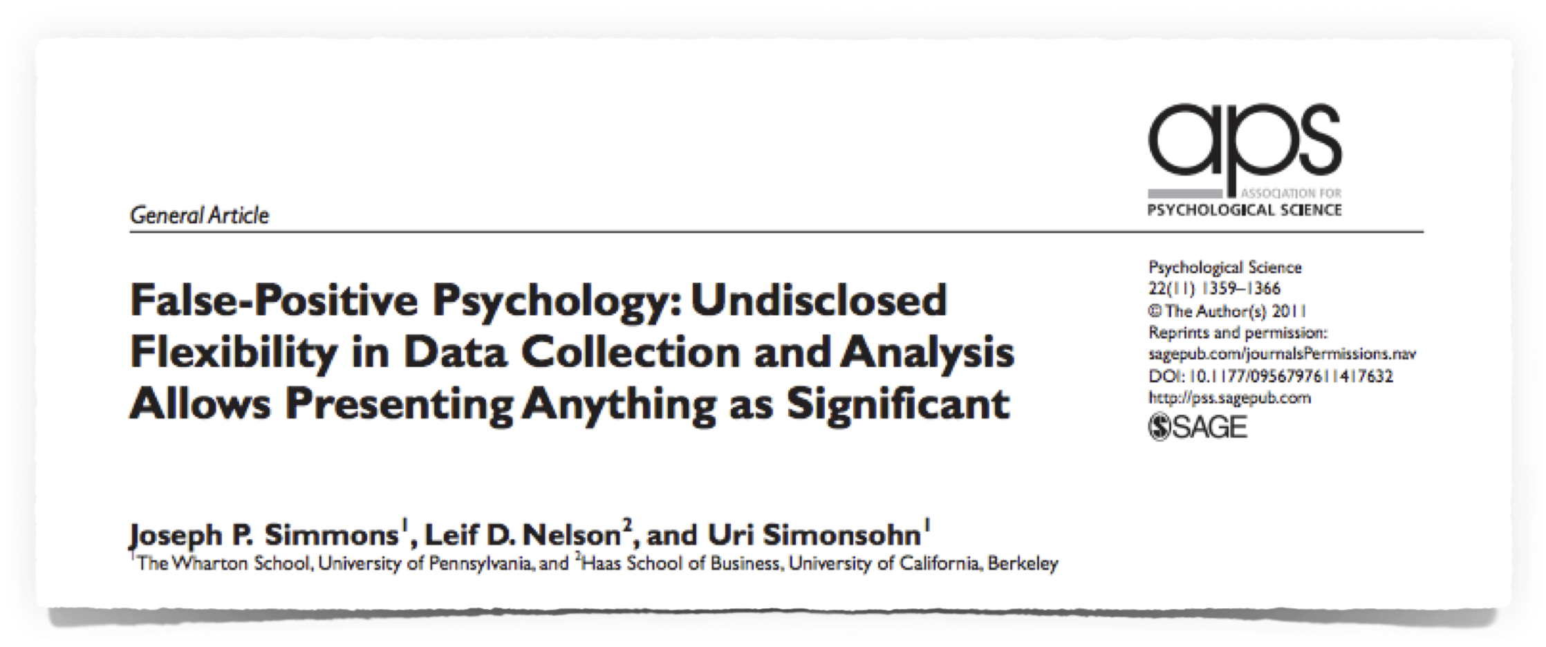 Simmons, J. P., Nelson, L. D., & Simonsohn, U. (2011). False-Positive Psychology: Undisclosed Flexibility in Data Collection and Analysis Allows Presenting Anything as Significant. Psychological Science, 22(11), 1359–1366. https://doi.org/10.1177/0956797611417632